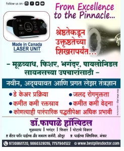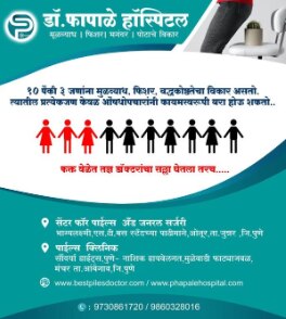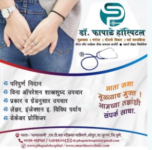 Phapale Hospital-Piles, Fissure, Fistula Treatment in Manchar / Otur / Junnar - 08042781872 - Piles Doctor in Junnar, Manchar, Otur | Fistula Treatment in Junnar, Manchar, Otur | Fissure Treatment in Junnar, Manchar, Otur. Dr. Phapale Hospital is located at OTUR, in Junnar Taluka in Pune district of Maharashtra, Established in the year 2007, Dr. Phapale Hospital treats patients who suffer from medical and surgical conditions like Piles, Fistula, Fissure and Pilonidal Sinus among the many others. The state of the art technology used in Dr. Phapale Hospital makes it one of the best treatment centers in Pune district. Dr. Shashank Phapale is a renowned Colorectal and LASER Surgeon having an experience of more than 10 years. Many treatment modalities are available for complete cure of PILES, FISSURE and FISTULA, such as Injection therapy, LASER treatment, Banding, Stapler surgery etc. Apart from this many general surgeries are being conducted in this hospital such as APPENDIX, HERNIA, HYDROCELE, CIRCUMCISION etc. There is a facility of laparoscopic surgery also.